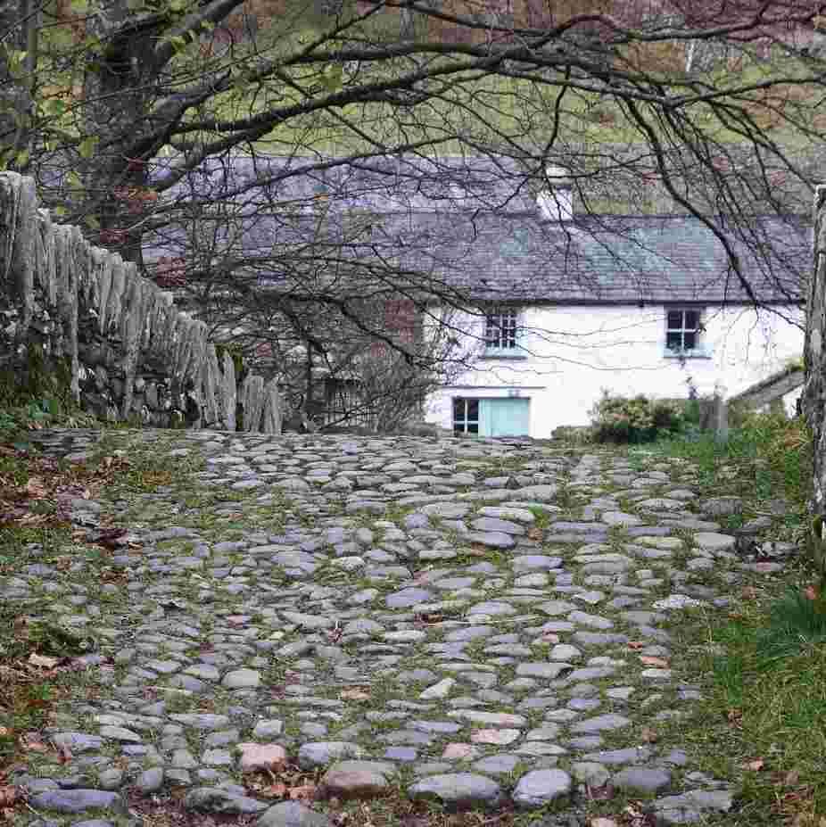 A packhorse bridge leads to a traditional Lake District farmhouse